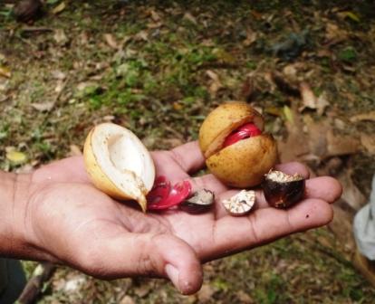 Two hooks on the end of a long stick are used to grab the nutmegs and then allow them to fall into the attached basket. The outer fruit of the nutmeg is used for making pickles and jam, the red ribbon around the shell is known as mace and has a delicate nutmeg flavour that is more valuable than the nutmeg itself, which is inside the shell.