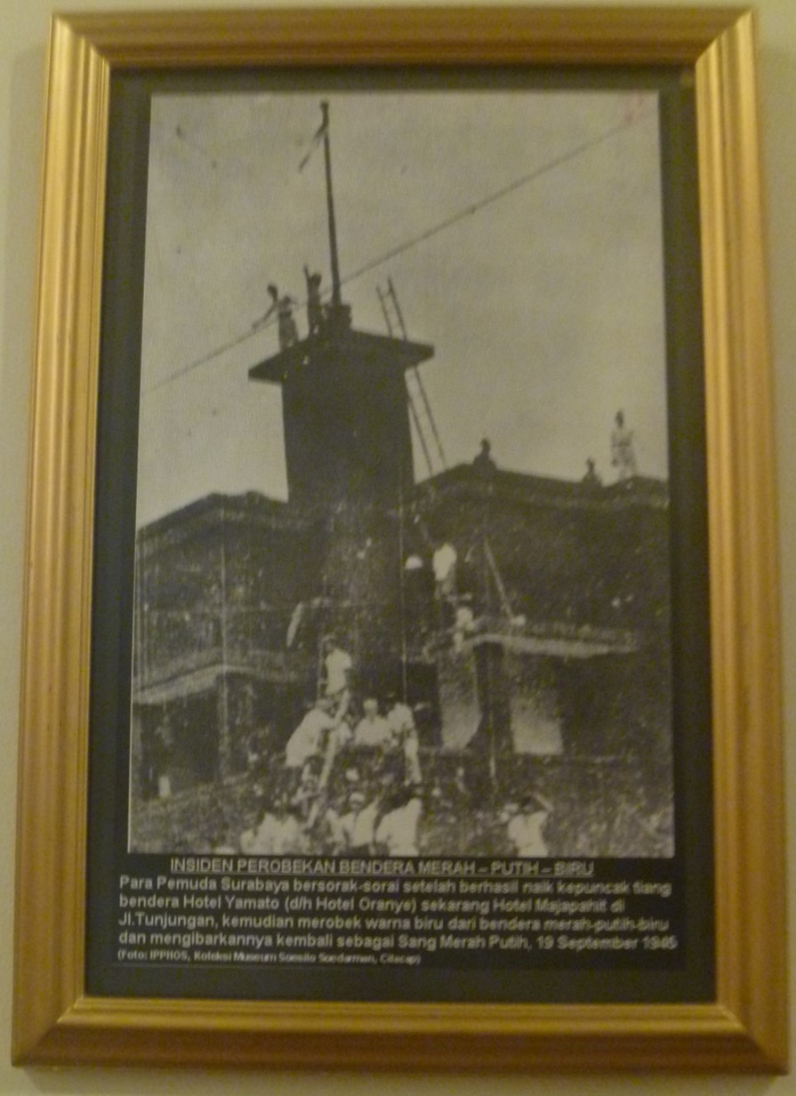 The Hotel Majapahit became part of Indonesia’s revolutionary history when at the end of WW II the Dutch flag was raised again over the hotel. This enraged the revolutionary youth of Surabaja who stormed the hotel and raised the Indonesian flag.