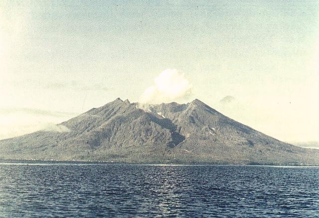 The island is characterized by a central volcano which has been breached by a large cleft on its northeast side, and the archival photo below clearly shows the cleft.