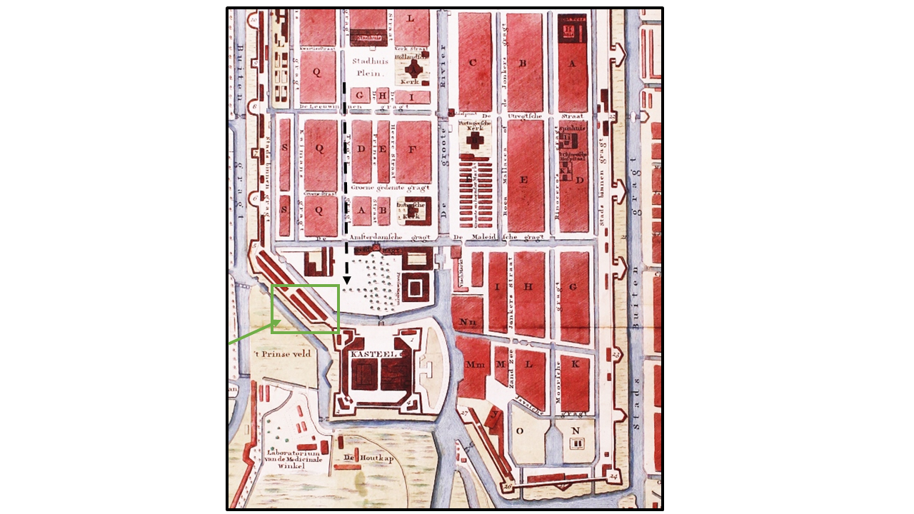 The map shows four warehouses originally built in this location but only one is remaining. These warehouses were built by the VOC from 1700 to 1752 in the eastern area between the City of Batavia and Kasteel Batavia. Known as the Graanpakhuizen (grainwarehouses) they were used to store corn, rice, beans, peanuts, peas, ships biscuit and other foodstuffs. It is possible to enter the abandoned warehouse and after you pick your way throught the dust, dirt and debris you can admire the massive teak beams used in its construction. There must be a way to preserve this historic building before it is allowed to be destroyed by the onslaught of ‘development’.