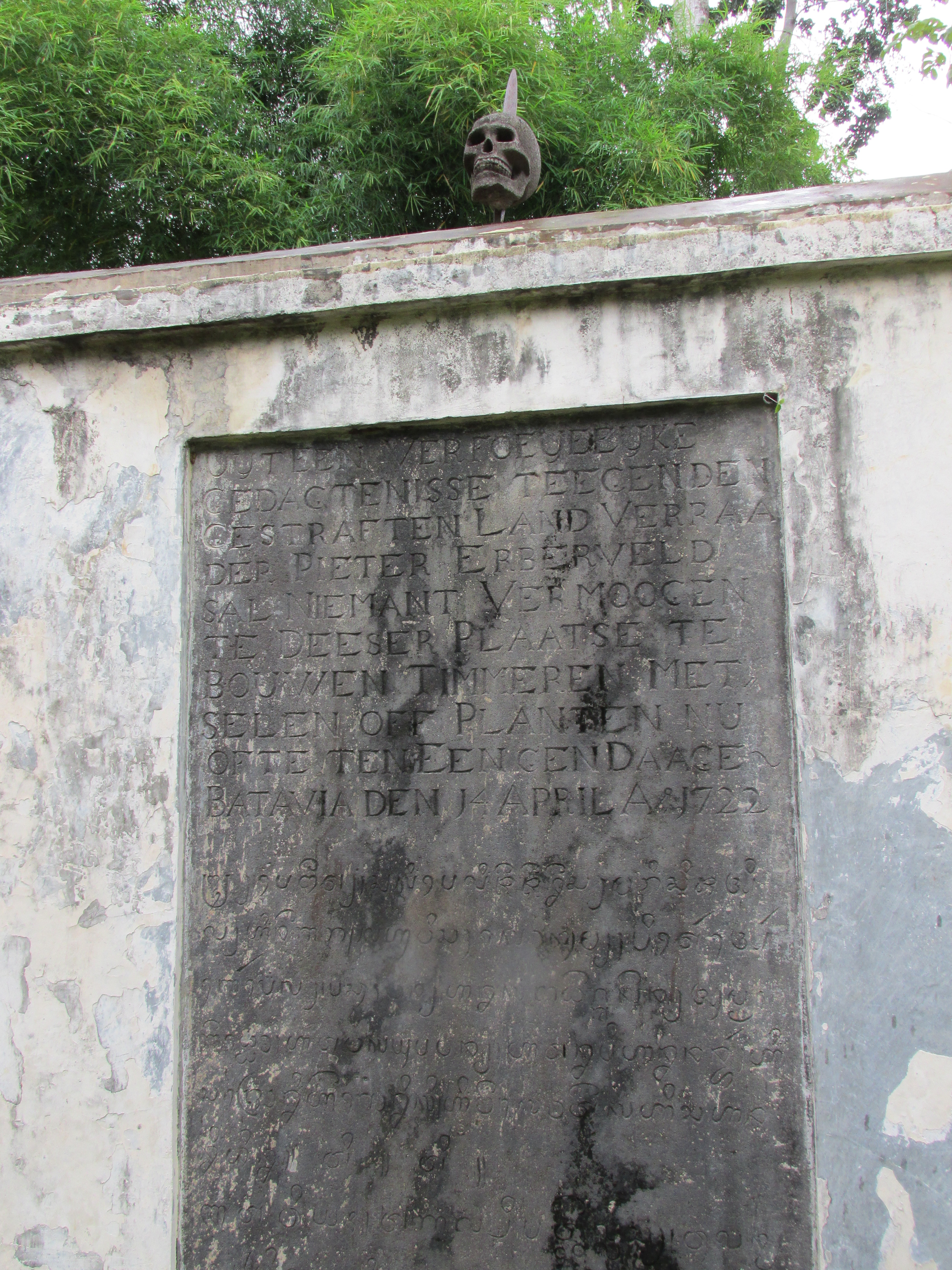 The stone tablet in memory of the traitor Peter Erberveld is inscribed in both Dutch and Javanese as a warning to all the 18th century inhabitants of Batavia.