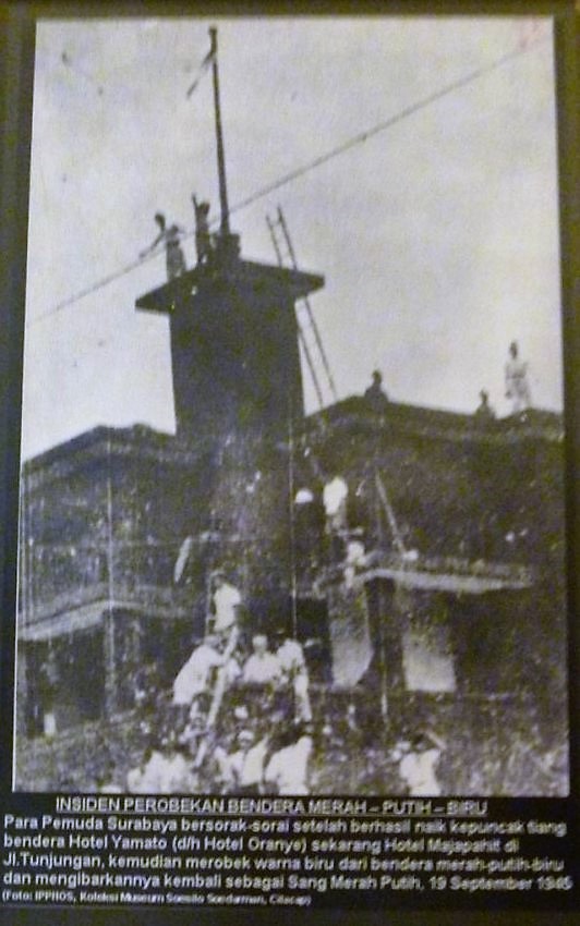 Perhaps the most celebrated incident related to the flag occurred one month later in Surabaya on 19 September 1945, when Dutch citizens released from Japanese detention raised the Dutch flag over the former Hotel Oranje which under the Japanese occupation was known as the Hotel Yamato. This incensed the pro-nationalist Indonesian youth who climbed the hotel tower and tore away the lower blue portion of the Dutch flag to change it to the red-and-white Indonesian Flag.