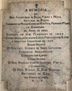 The history of Saint Joseph’s Church and that of its predecessor, the Church of São José, both built on the same site, is inextricably linked with the Portuguese Mission. Father Francisco da Silva Pinto e Maia of Porto arrived from Goa in 1826 and founded the Mission in Singapore. When he died in 1850, he left his money and some land for the building of a small church. The church, which was called São José, was built by the priest who succeeded him from 1851 to 1853, to mainly serve the Portuguese and Eurasian Catholics in Singapore.